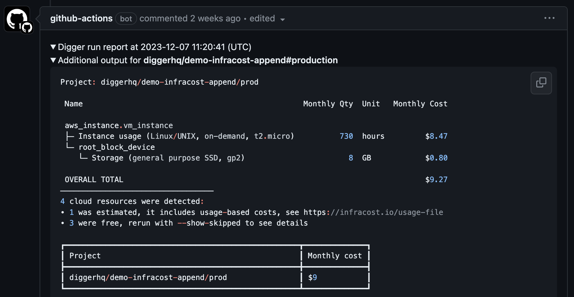 Forinfracost diff we’d need to run Infracost twice: first to generate the breakdown on the main branch, then to generate diff on the PR branch. To help with that, Digger provides additional environment variables like $PROJECT_NAME and $PR_BRANCH (see custom commands). You can then configure your workflow in digger.yml to switch branch to main, generate base breakdown, switch back to PR branch, generate diff and finally show it via $DIGGER_OUT, like below: