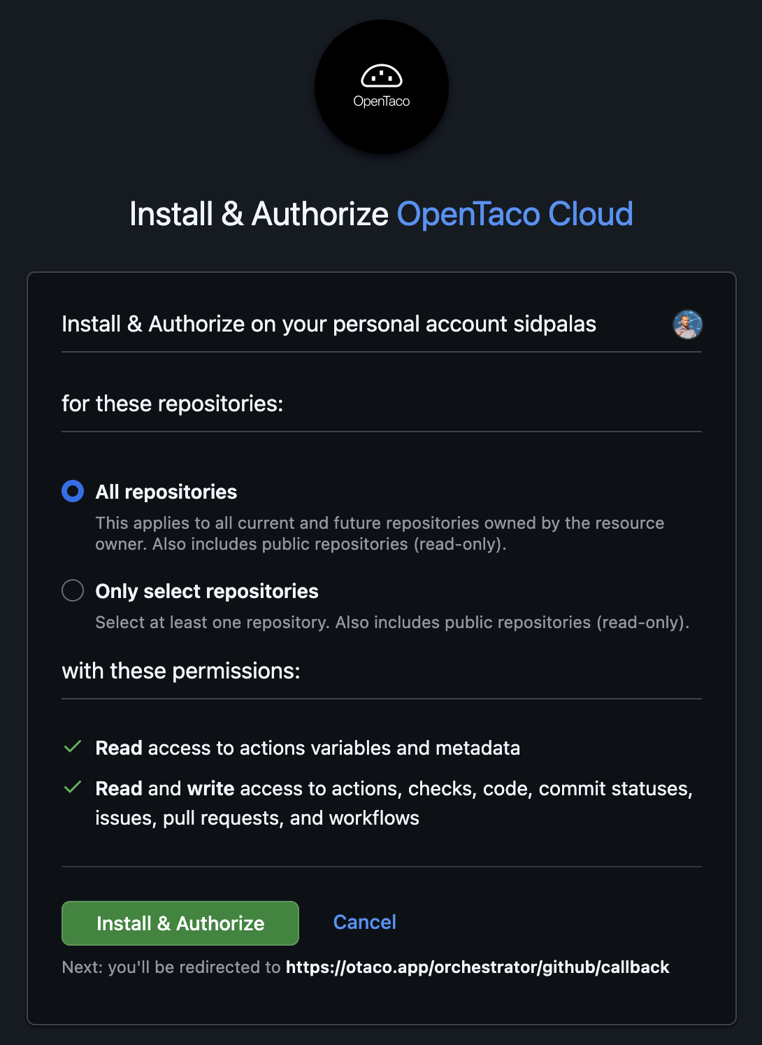 Install the OpenTaco GitHub App and grant access to the repositories you want to automate.
